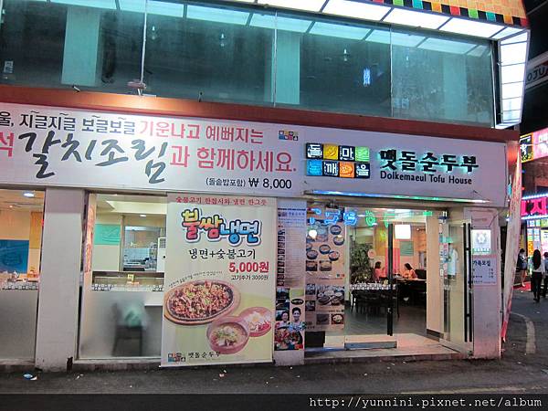 下了飛機狂奔搭上最後一班機場鐵路A'REX再搭上最後一班捷運奔到民宿check in之後,不管三七二十一我們行李丟著,就奔向也在新村24小時營業的嫩豆腐辣湯鍋돌깨마을맷돌순두부啦!